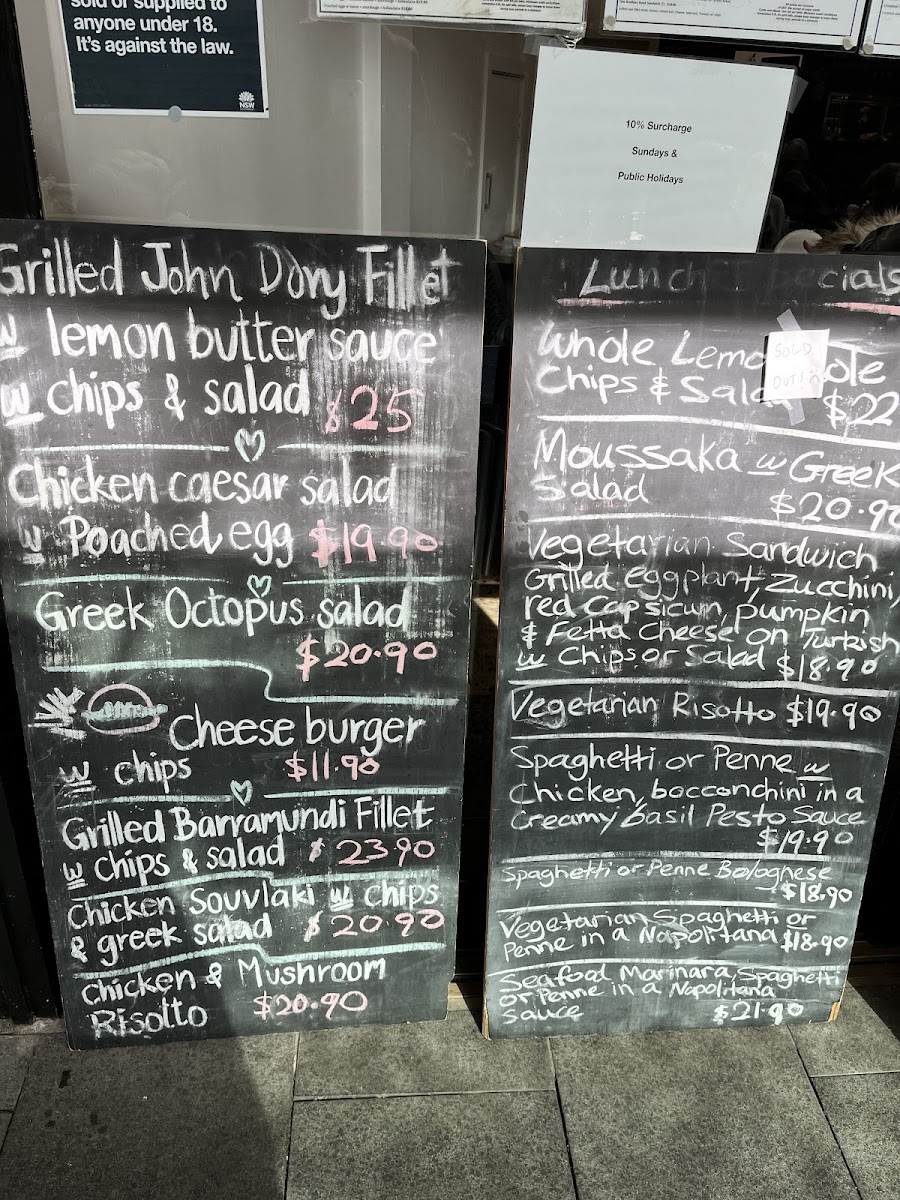 - Pasta and Main Dishes: Selection includes penne pasta in Napolitana sauce, spaghetti or penne with chicken and bocconcini in creamy basil pesto, spaghetti or penne Bolognese, chicken burger, moussaka with Greek salad, and fish & chips.